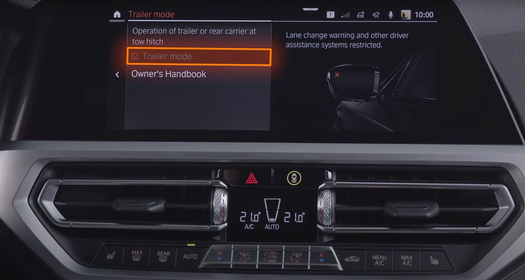 En los BMW con Sistema Operativo 7 puedes hacerlo yendo a: ‘COCHE’, ‘Ajustes’, ‘Ajustes generales’, ‘Modo remolque’, y seleccionar ‘Modo remolque’. Según el modelo y el equipamiento, se restringe el aviso de cambio de carril y otros sistemas de asistencia al conductor. Cuando se activa manualmente el modo remolque, no es posible replegar el enganche de remolque. También según el modelo y el equipamiento, otros sistemas, como el ajuste del nivel de la suspensión neumática, no están disponibles cuando se activa el modo remolque.